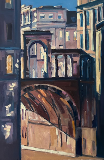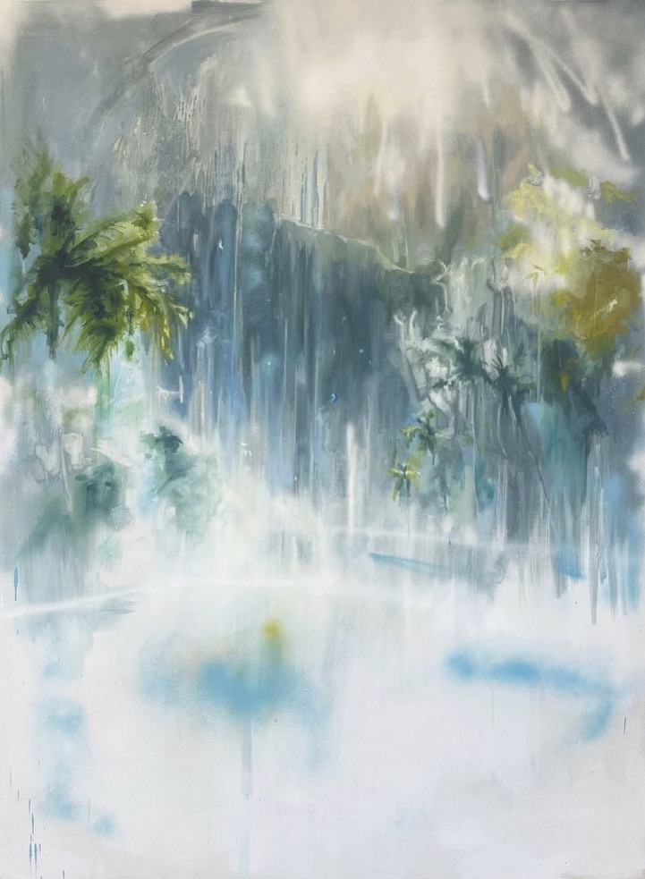 Hannah’s work considers a view as a reflection of the mind. Using meditation as a means to access a tranquil state, she paints from a place of stillness, often guided by the rhythmic force of music.